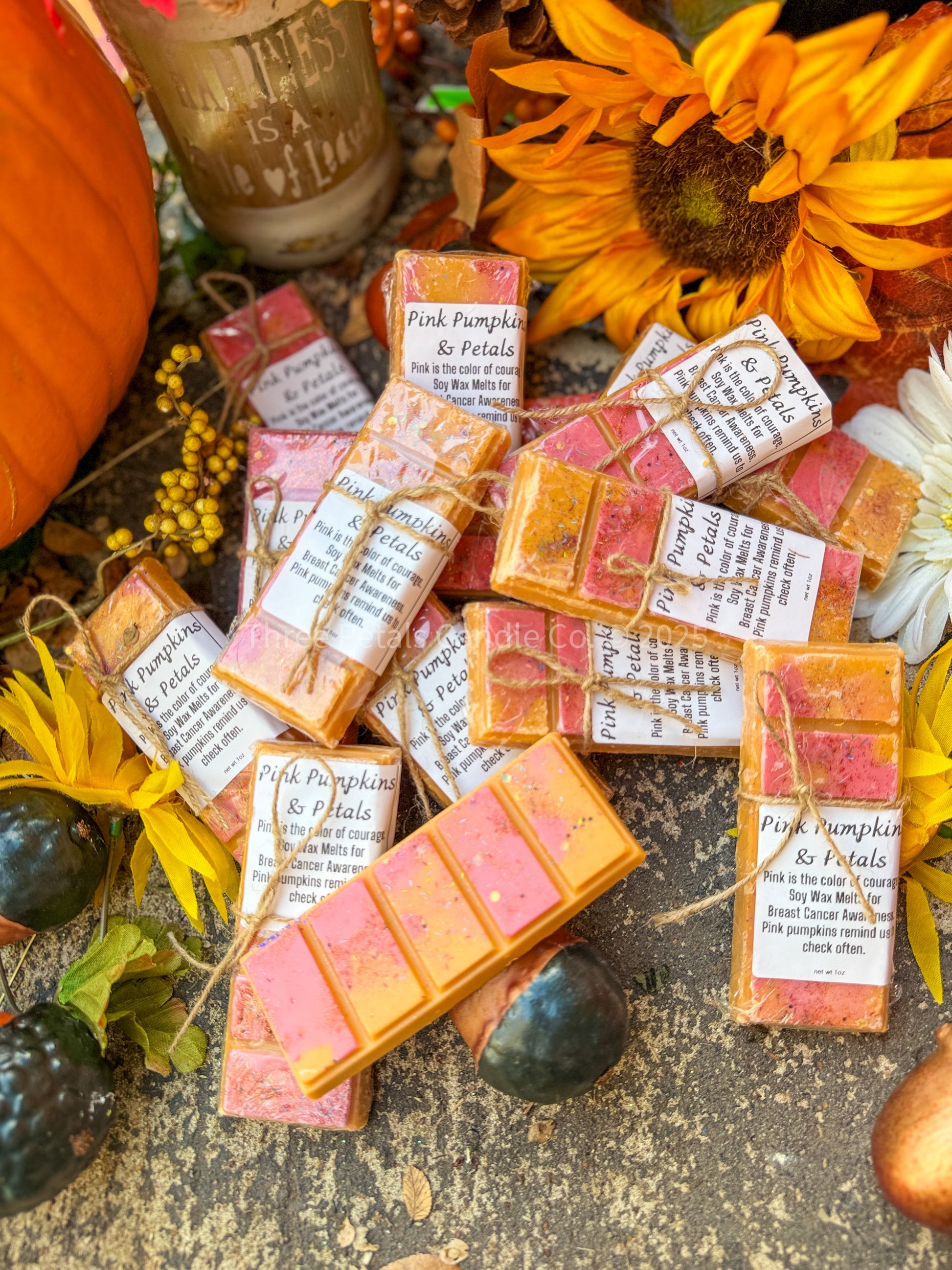 Our Pink Pumpkins & Petals wax melts were created in honor of Breast Cancer Awareness Month. Each bar blends autumn pumpkins with delicate florals, symbolizing strength, hope, and resilience.